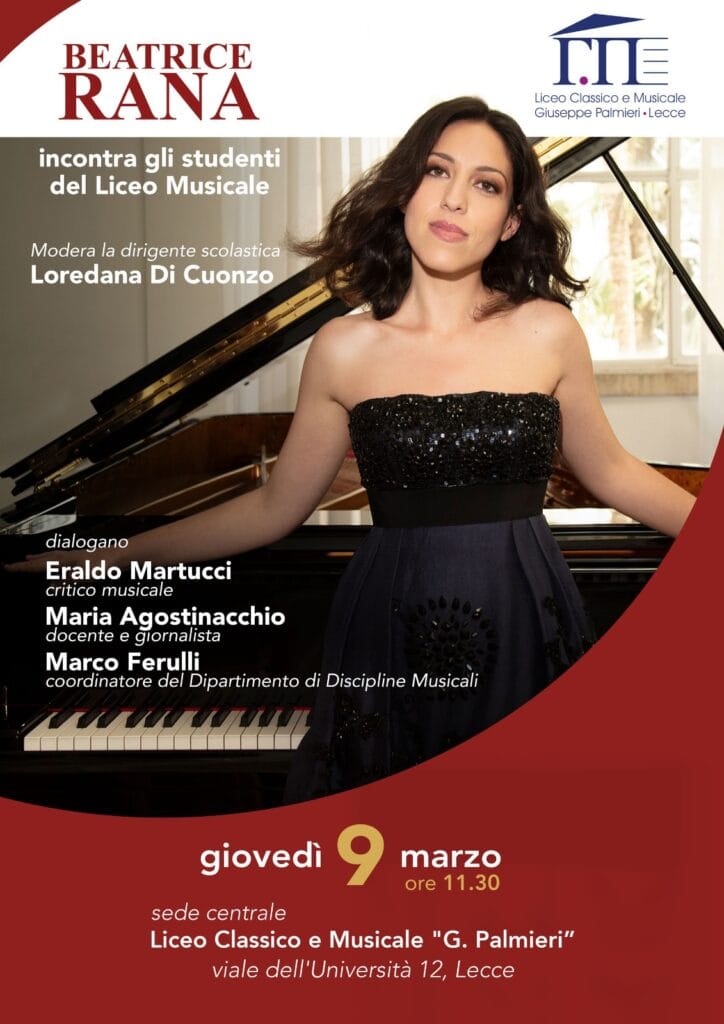 Beatrice Rana, la pianista italiana più famosa al mondo, di ritorno dalla tournée europea con i Wiener Symphoniker, incontra i ragazze e le ragazze del Liceo Musicale per condividere con loro il racconto della sua formazione, dell’impegno e della folgorante carriera.